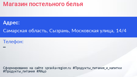 Магазин постельного белья по адресу Самарская область, Сызрань, Московская улица, 14/4 в дальнейшем Организация, размещена в следующих категориях: