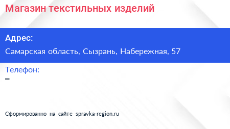 Магазин текстильных изделий по адресу Самарская область, Сызрань, Набережная, 57 в дальнейшем Организация, размещена в следующих категориях: