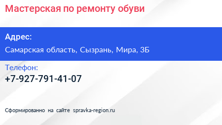 Мастерская по ремонту обуви по адресу Самарская область, Сызрань, Мира, 3Б в дальнейшем Организация, размещена в следующих категориях: