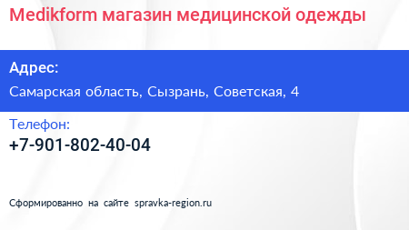 Medikform, магазин медицинской одежды по адресу Самарская область, Сызрань, Советская, 4 в дальнейшем Организация, размещена в следующих категориях: