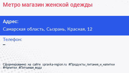 Метро, магазин женской одежды по адресу Самарская область, Сызрань, Красная, 12 в дальнейшем Организация, размещена в следующих категориях: