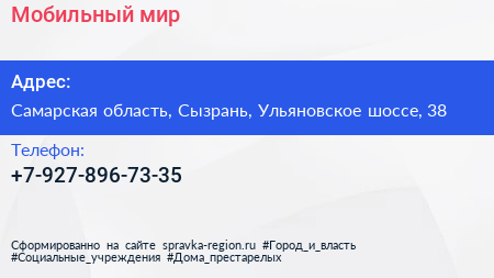Мобильный мир по адресу Самарская область, Сызрань, Ульяновское шоссе, 38 в дальнейшем Организация, размещена в следующих категориях: