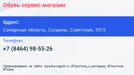Обувь-сервис, магазин по адресу Самарская область, Сызрань, Советская, 59/3 в дальнейшем Организация, размещена в следующих категориях: