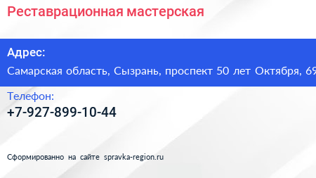 Реставрационная мастерская по адресу Самарская область, Сызрань, проспект 50 лет Октября, 69 в дальнейшем Организация, размещена в следующих категориях: