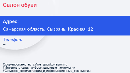 Салон обуви по адресу Самарская область, Сызрань, Красная, 12 в дальнейшем Организация, размещена в следующих категориях: