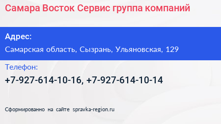 Самара-Восток-Сервис, группа компаний по адресу Самарская область, Сызрань, Ульяновская, 129 в дальнейшем Организация, размещена в следующих категориях: