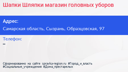 Шапки Шляпки, магазин головных уборов по адресу Самарская область, Сызрань, Образцовская, 97 в дальнейшем Организация, размещена в следующих категориях: