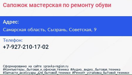 Сапожок, мастерская по ремонту обуви по адресу Самарская область, Сызрань, Советская, 9 в дальнейшем Организация, размещена в следующих категориях: