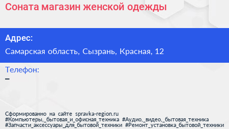 Соната, магазин женской одежды по адресу Самарская область, Сызрань, Красная, 12 в дальнейшем Организация, размещена в следующих категориях: