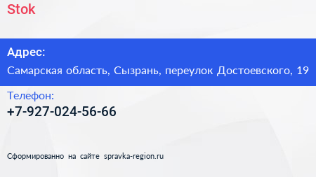 Stok по адресу Самарская область, Сызрань, переулок Достоевского, 19 в дальнейшем Организация, размещена в следующих категориях: