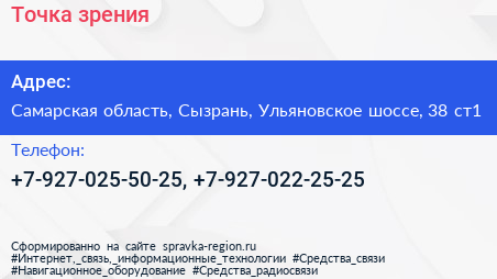 Точка зрения по адресу Самарская область, Сызрань, Ульяновское шоссе, 38 ст1 в дальнейшем Организация, размещена в следующих категориях: