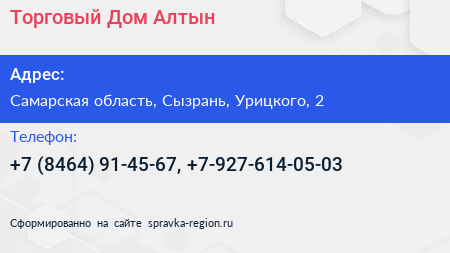 Торговый Дом Алтын по адресу Самарская область, Сызрань, Урицкого, 2 в дальнейшем Организация, размещена в следующих категориях: