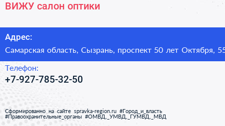 ВИЖУ, салон оптики по адресу Самарская область, Сызрань, проспект 50 лет Октября, 55 в дальнейшем Организация, размещена в следующих категориях: