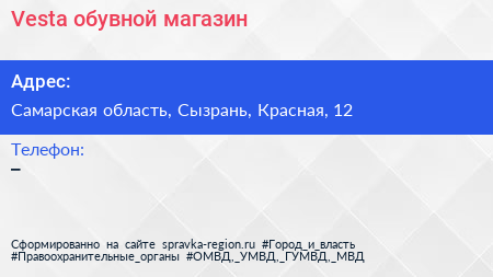 Vesta, обувной магазин по адресу Самарская область, Сызрань, Красная, 12 в дальнейшем Организация, размещена в следующих категориях:
