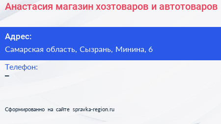 Анастасия, магазин хозтоваров и автотоваров по адресу Самарская область, Сызрань, Минина, 6 в дальнейшем Организация, размещена в следующих категориях: