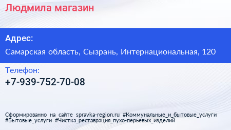 Людмила, магазин по адресу Самарская область, Сызрань, Интернациональная, 120 в дальнейшем Организация, размещена в следующих категориях: