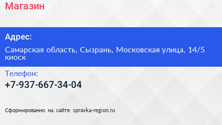 Магазин по адресу Самарская область, Сызрань, Московская улица, 14/5 киоск в дальнейшем Организация, размещена в следующих категориях:
