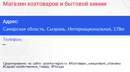 Магазин хозтоваров и бытовой химии по адресу Самарская область, Сызрань, Интернациональная, 178м в дальнейшем Организация, размещена в следующих категориях: