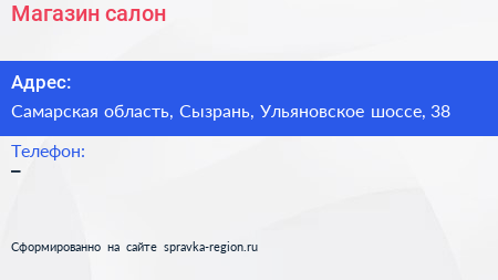 Магазин-салон по адресу Самарская область, Сызрань, Ульяновское шоссе, 38 в дальнейшем Организация, размещена в следующих категориях: