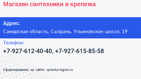 Магазин сантехники и крепежа по адресу Самарская область, Сызрань, Ульяновское шоссе, 19 в дальнейшем Организация, размещена в следующих категориях: