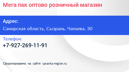 Мега & пак, оптово-розничный магазин по адресу Самарская область, Сызрань, Чапаева, 30 в дальнейшем Организация, размещена в следующих категориях: