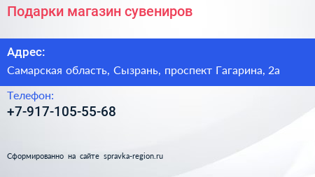 Подарки, магазин сувениров по адресу Самарская область, Сызрань, проспект Гагарина, 2а в дальнейшем Организация, размещена в следующих категориях: