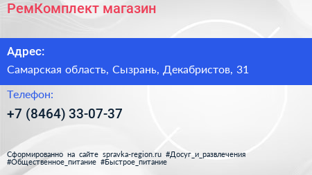 РемКомплект, магазин по адресу Самарская область, Сызрань, Декабристов, 31 в дальнейшем Организация, размещена в следующих категориях: