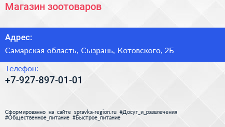 Магазин зоотоваров по адресу Самарская область, Сызрань, Котовского, 2Б в дальнейшем Организация, размещена в следующих категориях: