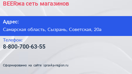 BEERжа, сеть магазинов по адресу Самарская область, Сызрань, Советская, 20а в дальнейшем Организация, размещена в следующих категориях:
