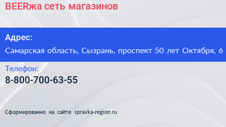 BEERжа, сеть магазинов по адресу Самарская область, Сызрань, проспект 50 лет Октября, 6 в дальнейшем Организация, размещена в следующих категориях: