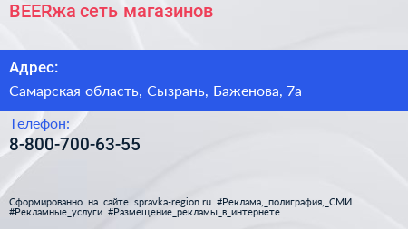 BEERжа, сеть магазинов по адресу Самарская область, Сызрань, Баженова, 7а в дальнейшем Организация, размещена в следующих категориях: