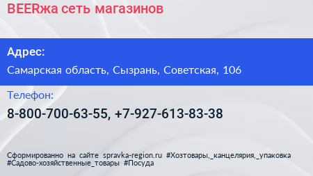 BEERжа, сеть магазинов по адресу Самарская область, Сызрань, Советская, 106 в дальнейшем Организация, размещена в следующих категориях: