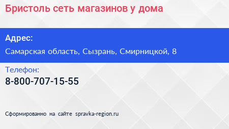 Бристоль, сеть магазинов у дома по адресу Самарская область, Сызрань, Смирницкой, 8 в дальнейшем Организация, размещена в следующих категориях: