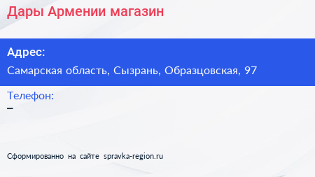 Дары Армении, магазин по адресу Самарская область, Сызрань, Образцовская, 97 в дальнейшем Организация, размещена в следующих категориях: