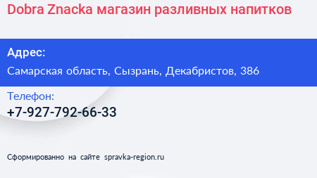 Dobra Znacka, магазин разливных напитков по адресу Самарская область, Сызрань, Декабристов, 386 в дальнейшем Организация, размещена в следующих категориях: