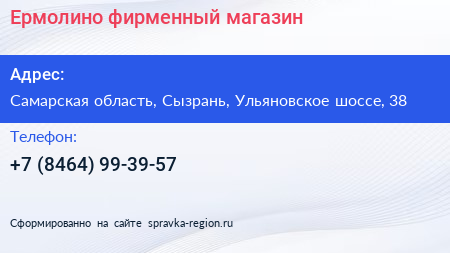 Ермолино, фирменный магазин по адресу Самарская область, Сызрань, Ульяновское шоссе, 38 в дальнейшем Организация, размещена в следующих категориях: