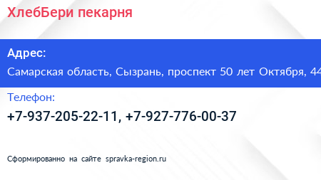 ХлебБери, пекарня по адресу Самарская область, Сызрань, проспект 50 лет Октября, 44 в дальнейшем Организация, размещена в следующих категориях: