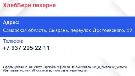 ХлебБери, пекарня по адресу Самарская область, Сызрань, переулок Достоевского, 19 в дальнейшем Организация, размещена в следующих категориях: