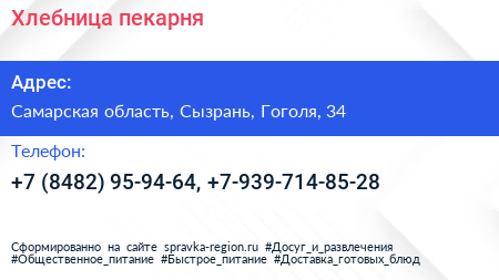 Хлебница, пекарня по адресу Самарская область, Сызрань, Гоголя, 34 в дальнейшем Организация, размещена в следующих категориях: