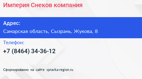 Империя Снеков, компания по адресу Самарская область, Сызрань, Жукова, 8 в дальнейшем Организация, размещена в следующих категориях: