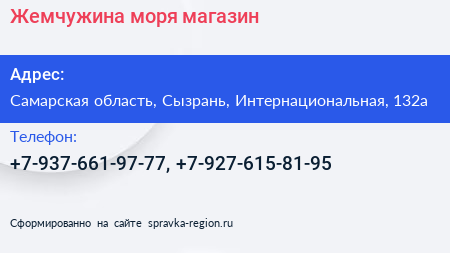 Жемчужина моря, магазин по адресу Самарская область, Сызрань, Интернациональная, 132а в дальнейшем Организация, размещена в следующих категориях: