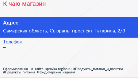 К чаю, магазин по адресу Самарская область, Сызрань, проспект Гагарина, 2/3 в дальнейшем Организация, размещена в следующих категориях: