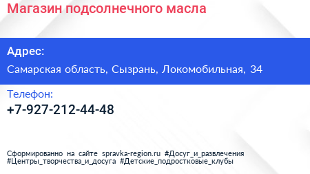 Магазин подсолнечного масла по адресу Самарская область, Сызрань, Локомобильная, 34 в дальнейшем Организация, размещена в следующих категориях: