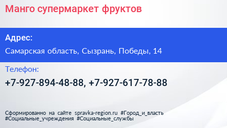 Манго, супермаркет фруктов по адресу Самарская область, Сызрань, Победы, 14 в дальнейшем Организация, размещена в следующих категориях: