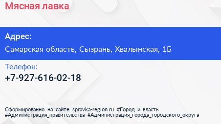 Мясная лавка по адресу Самарская область, Сызрань, Хвалынская, 1Б в дальнейшем Организация, размещена в следующих категориях: