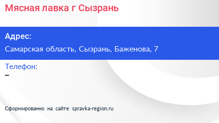 Мясная лавка, г. Сызрань по адресу Самарская область, Сызрань, Баженова, 7 в дальнейшем Организация, размещена в следующих категориях: