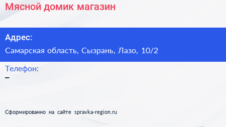 Мясной домик, магазин по адресу Самарская область, Сызрань, Лазо, 10/2 в дальнейшем Организация, размещена в следующих категориях:
