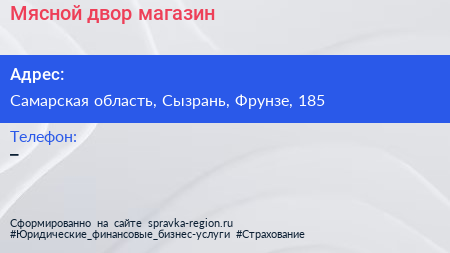 Мясной двор, магазин по адресу Самарская область, Сызрань, Фрунзе, 185 в дальнейшем Организация, размещена в следующих категориях: