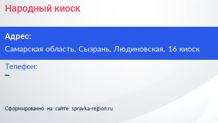 Народный, киоск по адресу Самарская область, Сызрань, Людиновская, 16 киоск в дальнейшем Организация, размещена в следующих категориях: