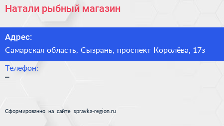 Натали, рыбный магазин по адресу Самарская область, Сызрань, проспект Королёва, 17з в дальнейшем Организация, размещена в следующих категориях: